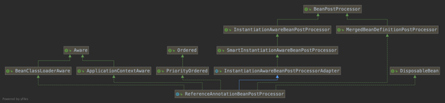 当你加入Dubbo的spring boot starter时,会往容器中注入ReferenceAnnotationBeanPostProcessor,看一下这个类的继承关系
