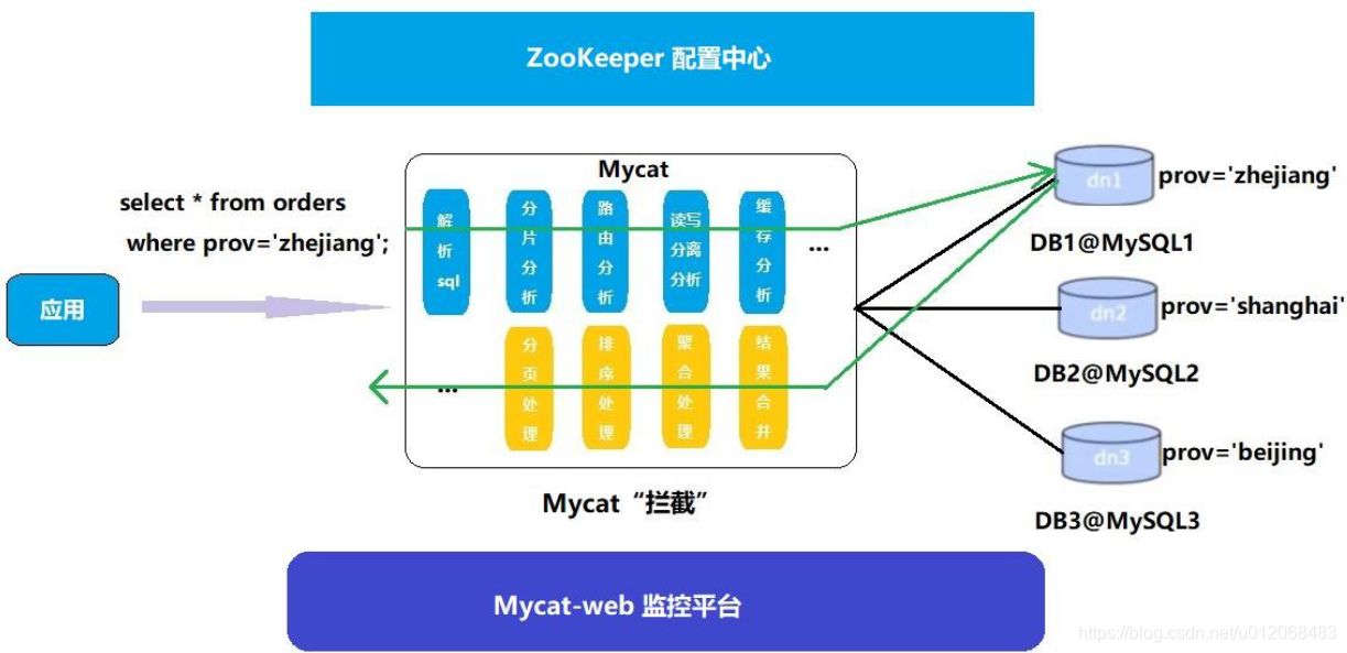 Mycat是一个专门的分布式数据库中间件,应用程序像连接数据库一样的连接Mycat,而数据分片的操作完全交给了Mycat去完成 如下。